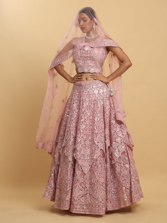 Drishti Pink Mirror Embroidered Leaf Neck Lehenga Set