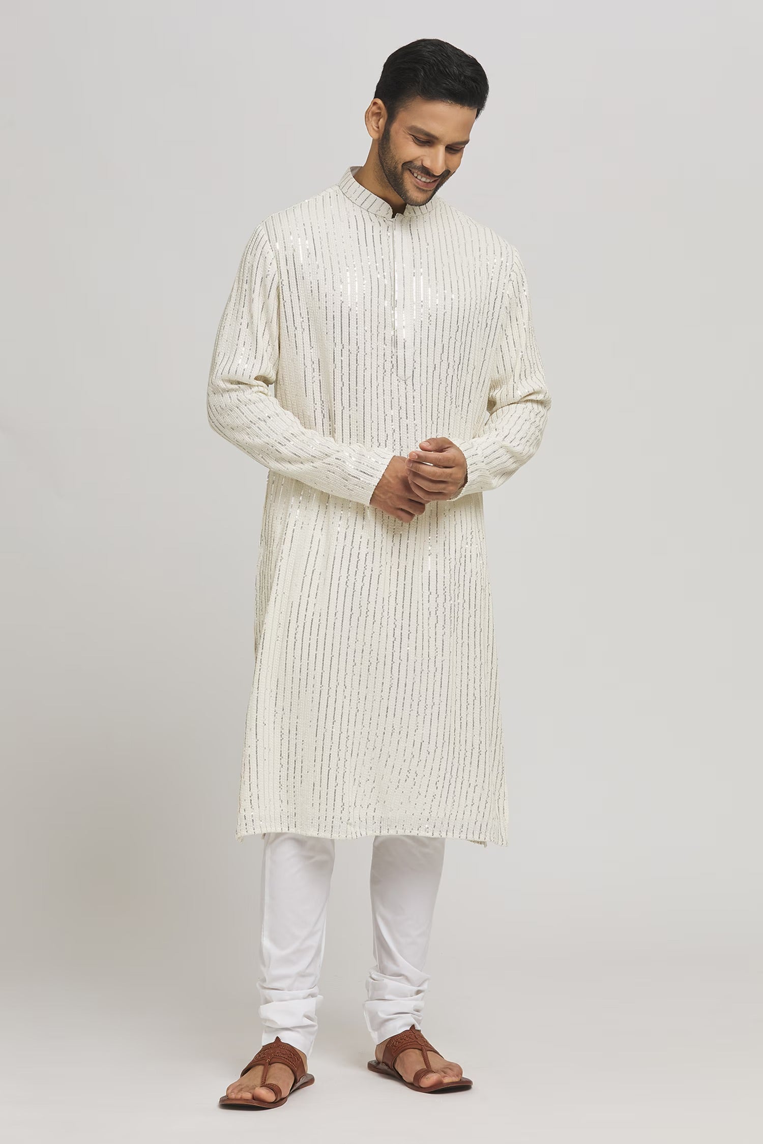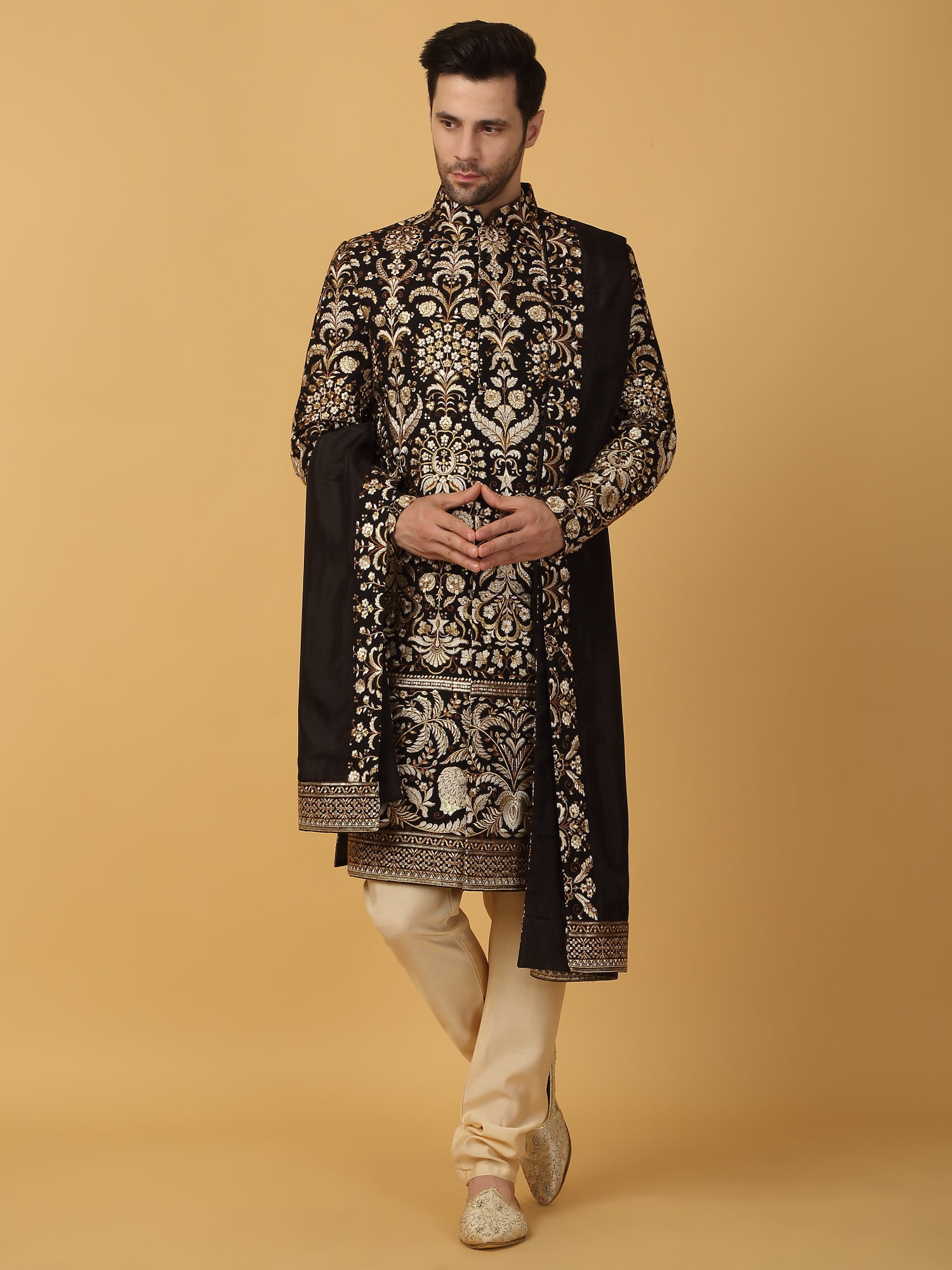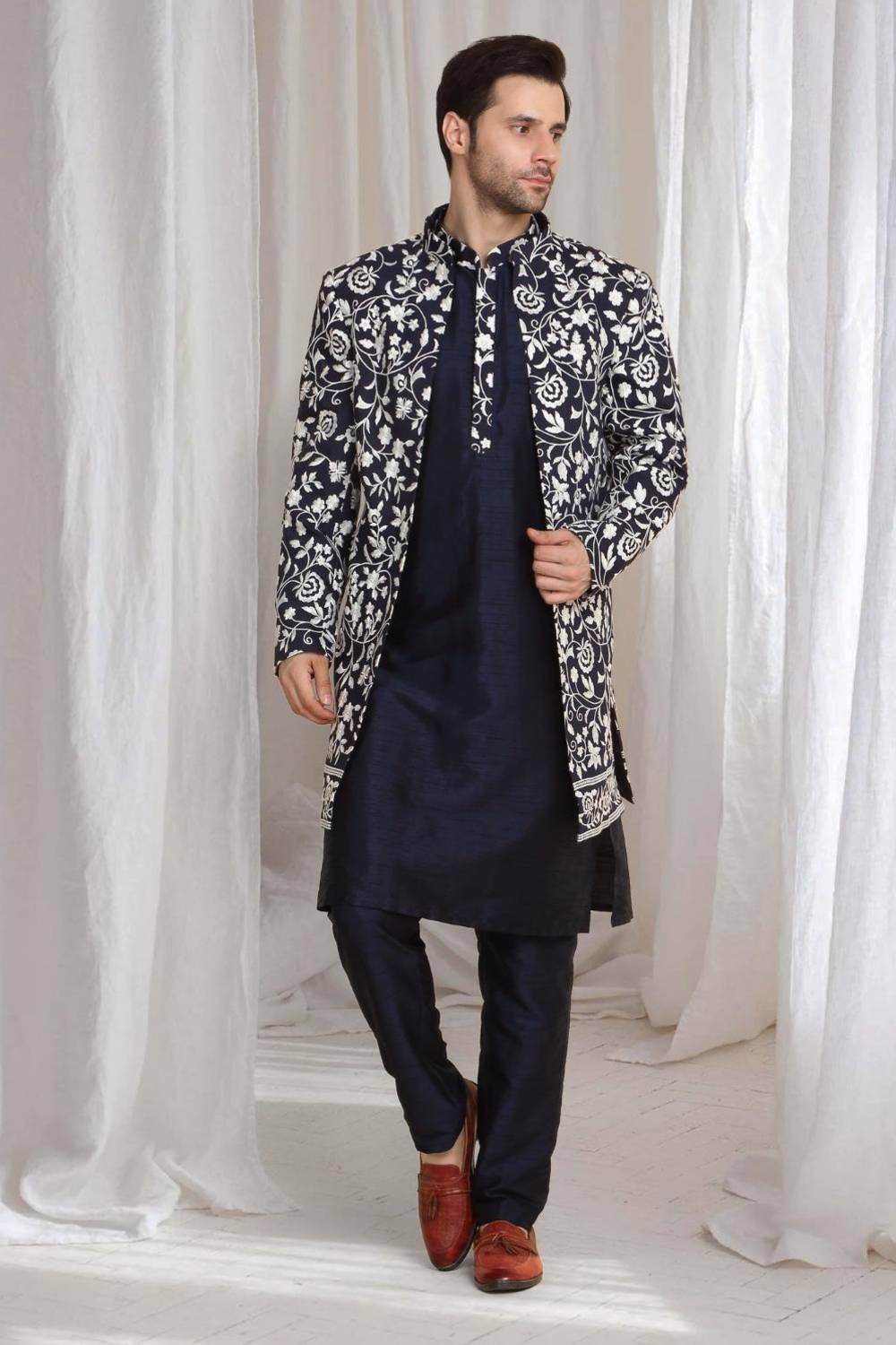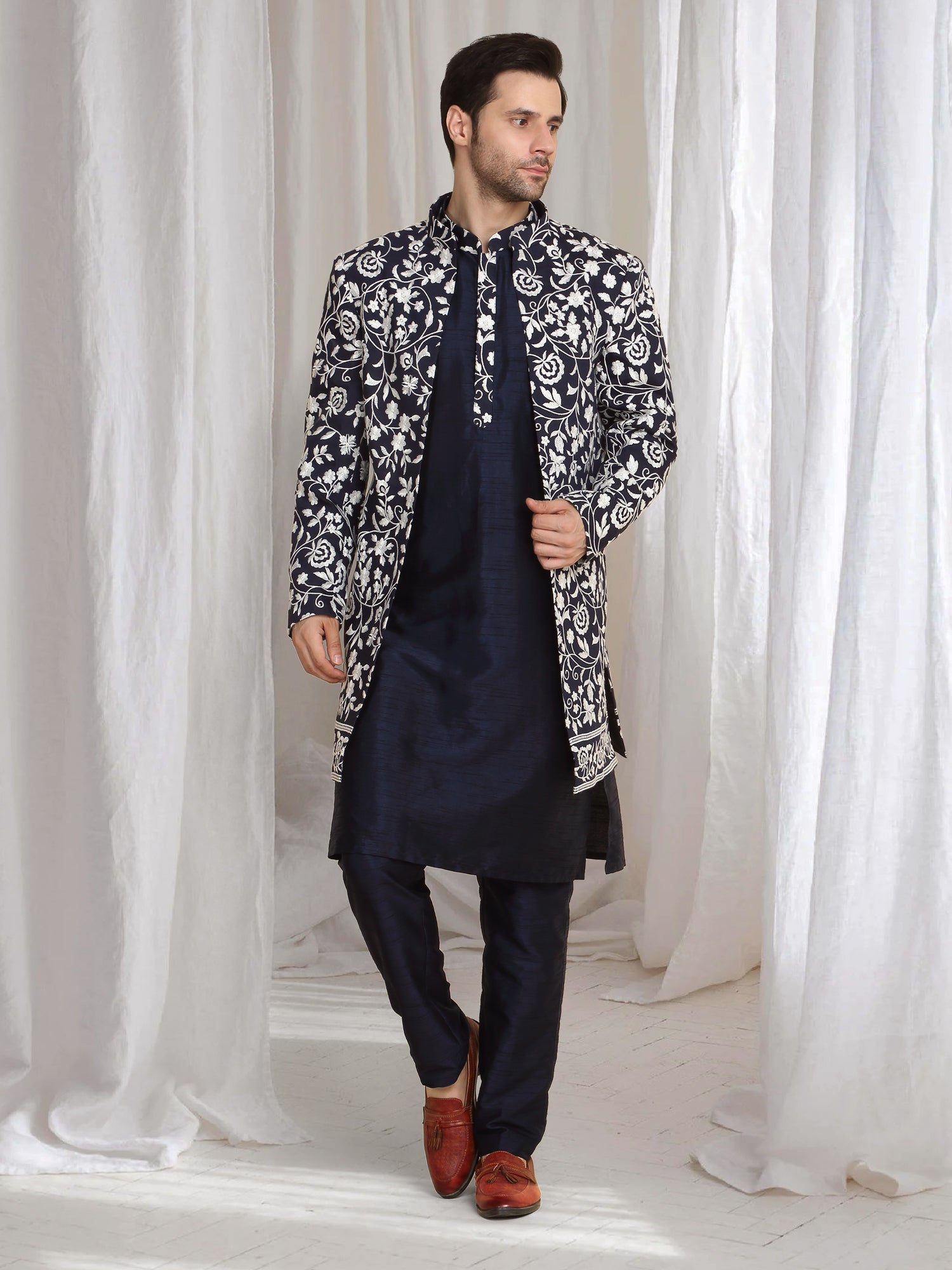 Ivory cotton silkLong Jacket with royal motif embroidery. Paired with Ivory kurta & matching pants .