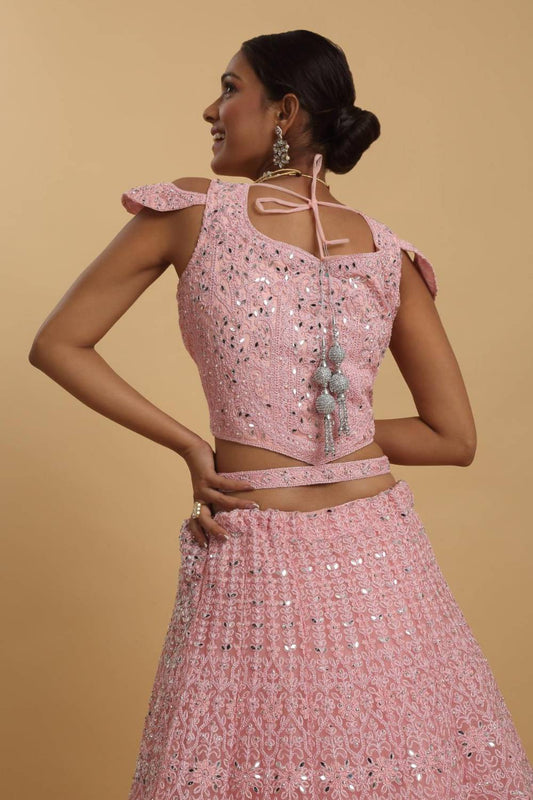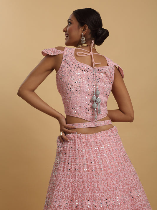 Drishti Pink Mirror Embroidered Leaf Neck Lehenga Set