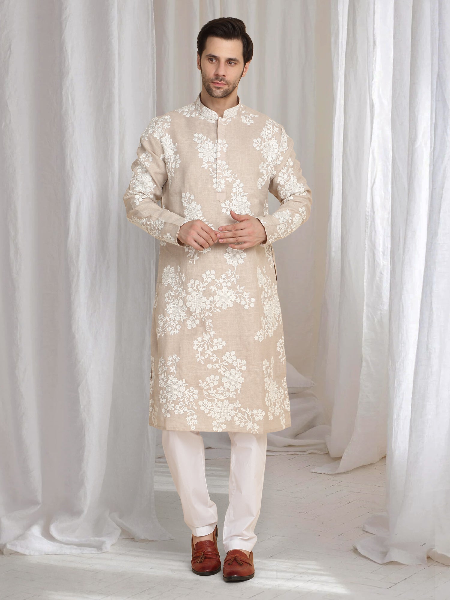 Brown and beige kurta featuring thread embroidery and a mandarin collar.Floral thread embroidery design, Mandarin collar style, Side slits for ease of movement