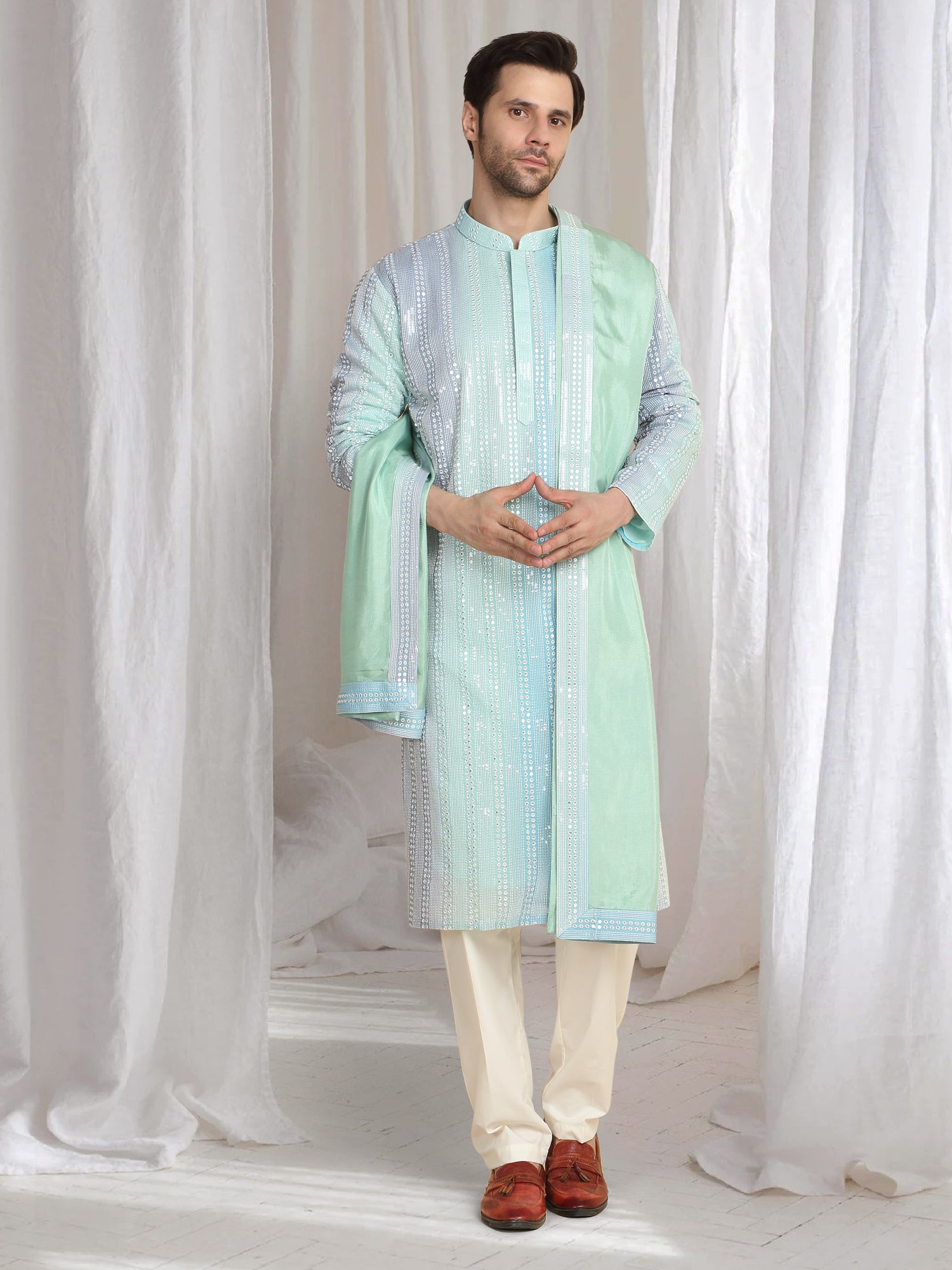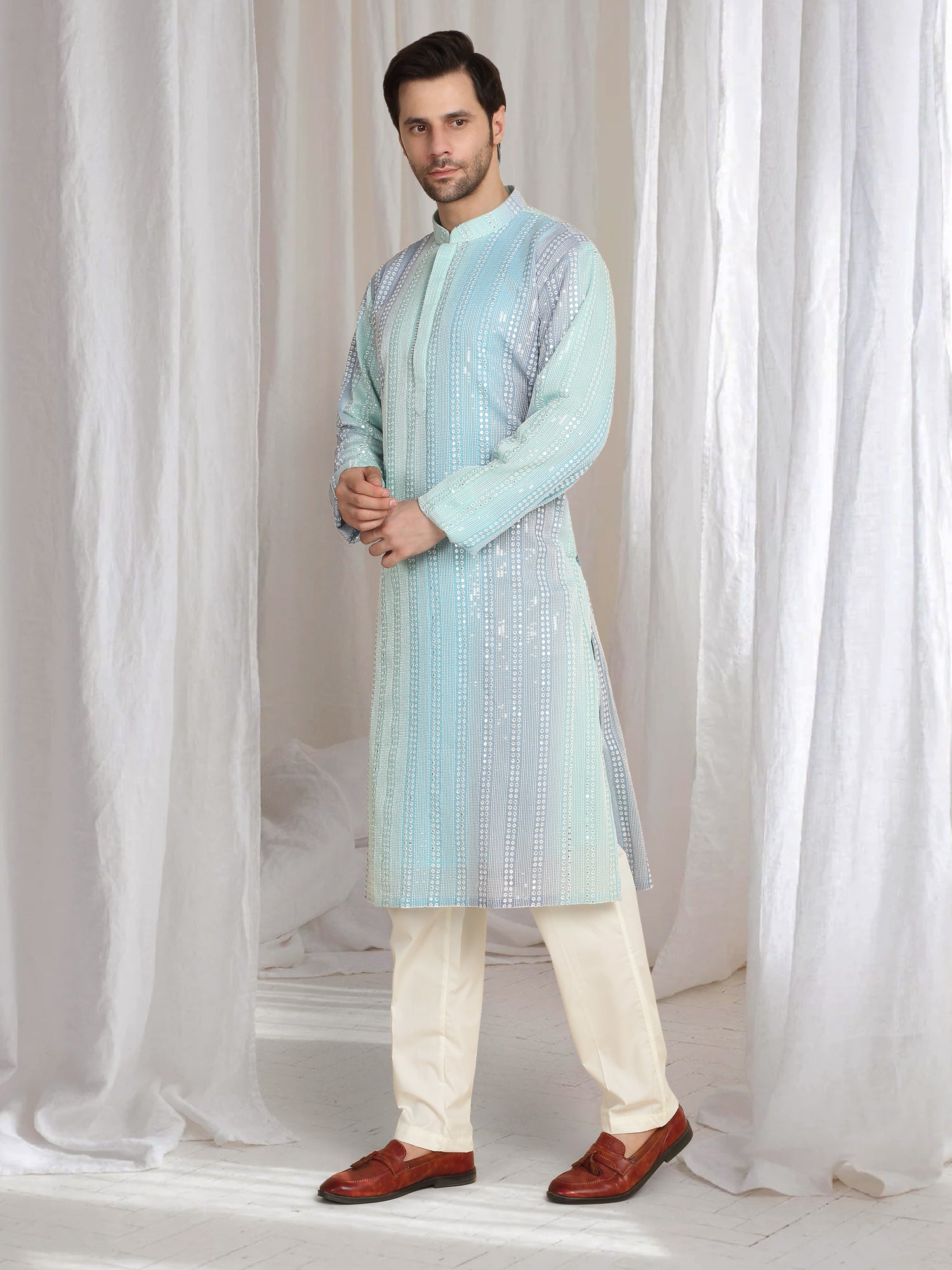 Ombre blue kurta featuring intricate embroidery and a mandarin collar. Paired with a matching sea green dupatta.Intricate embroidery in a striped pattern, Mandarin collar design, Lightweight cotton fabric