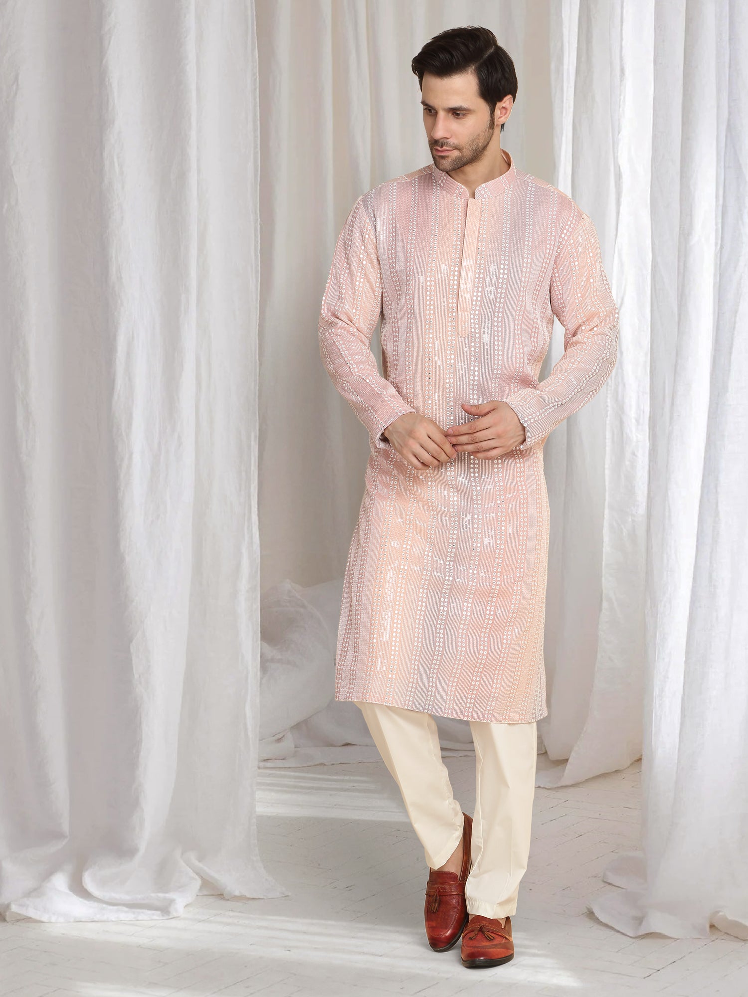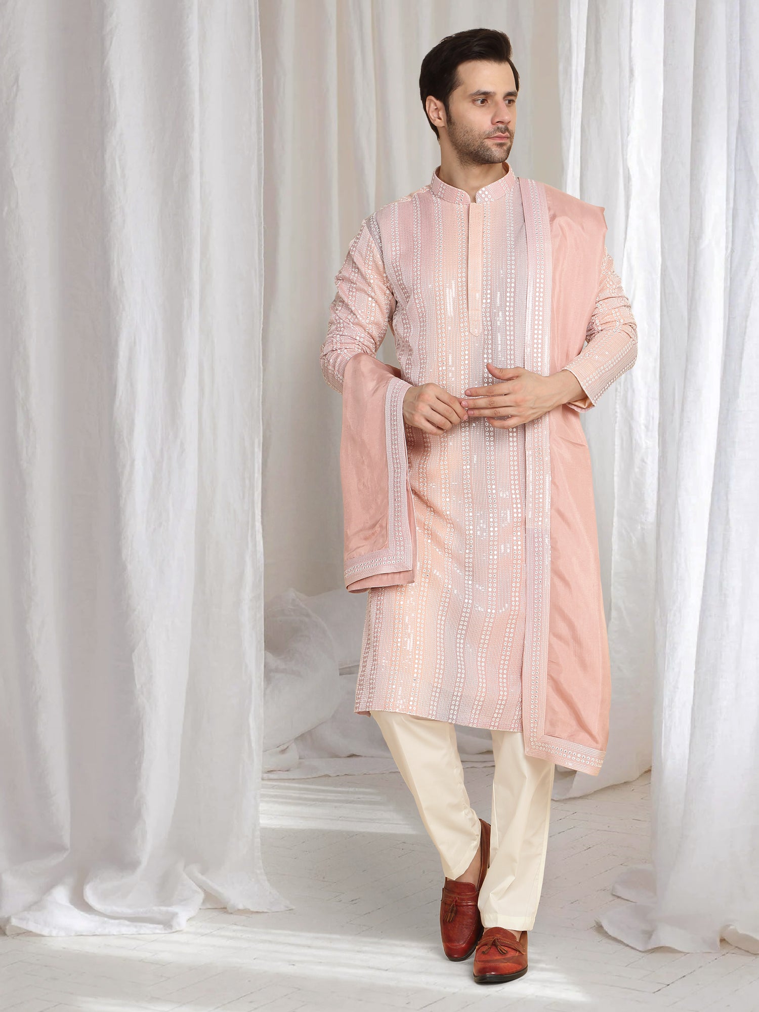 Ombre Pastel Coral kurta featuring intricate embroidery and a mandarin collar. Paired with a matching sea green dupatta.Intricate embroidery in a striped pattern, Mandarin collar design, Lightweight cotton fabric