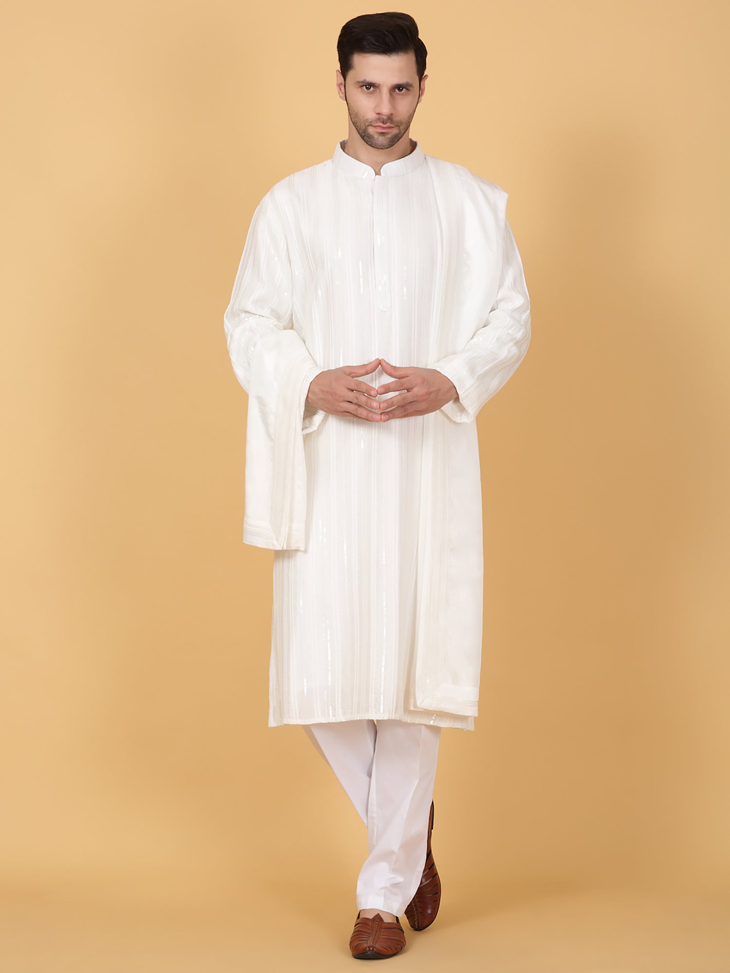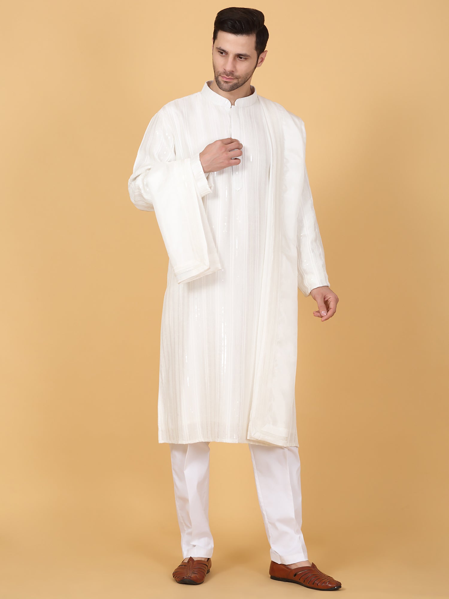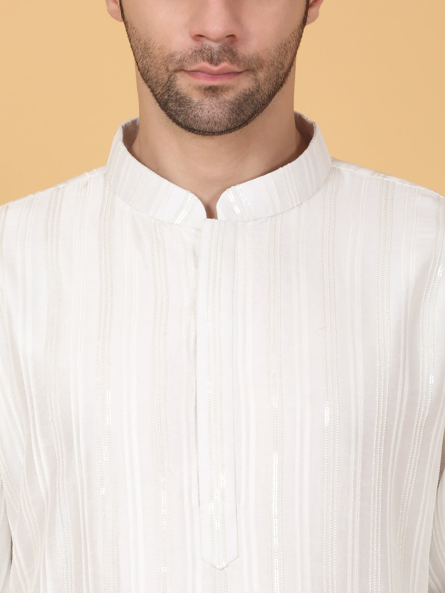 Off-white kurta featuring bead and sequin embroidery in a stripe pattern. Paired with matching pant and dupatta.Bead and sequin embroidery in stripe pattern, Side pockets in kurta.