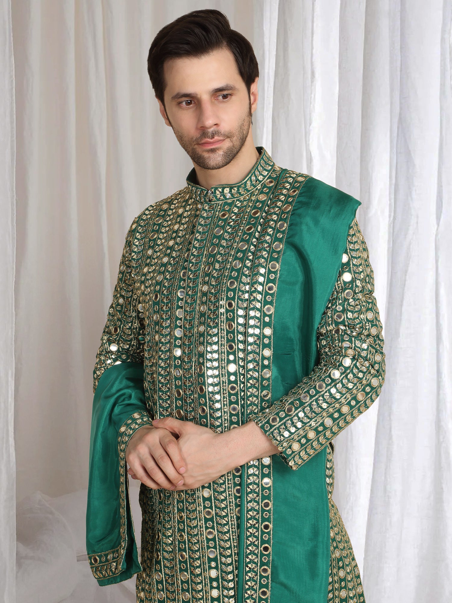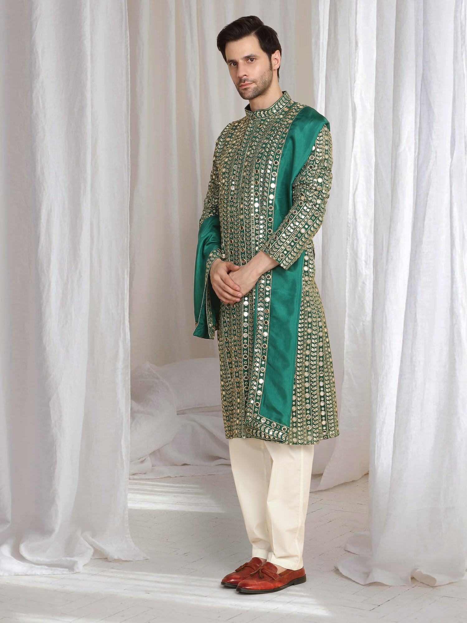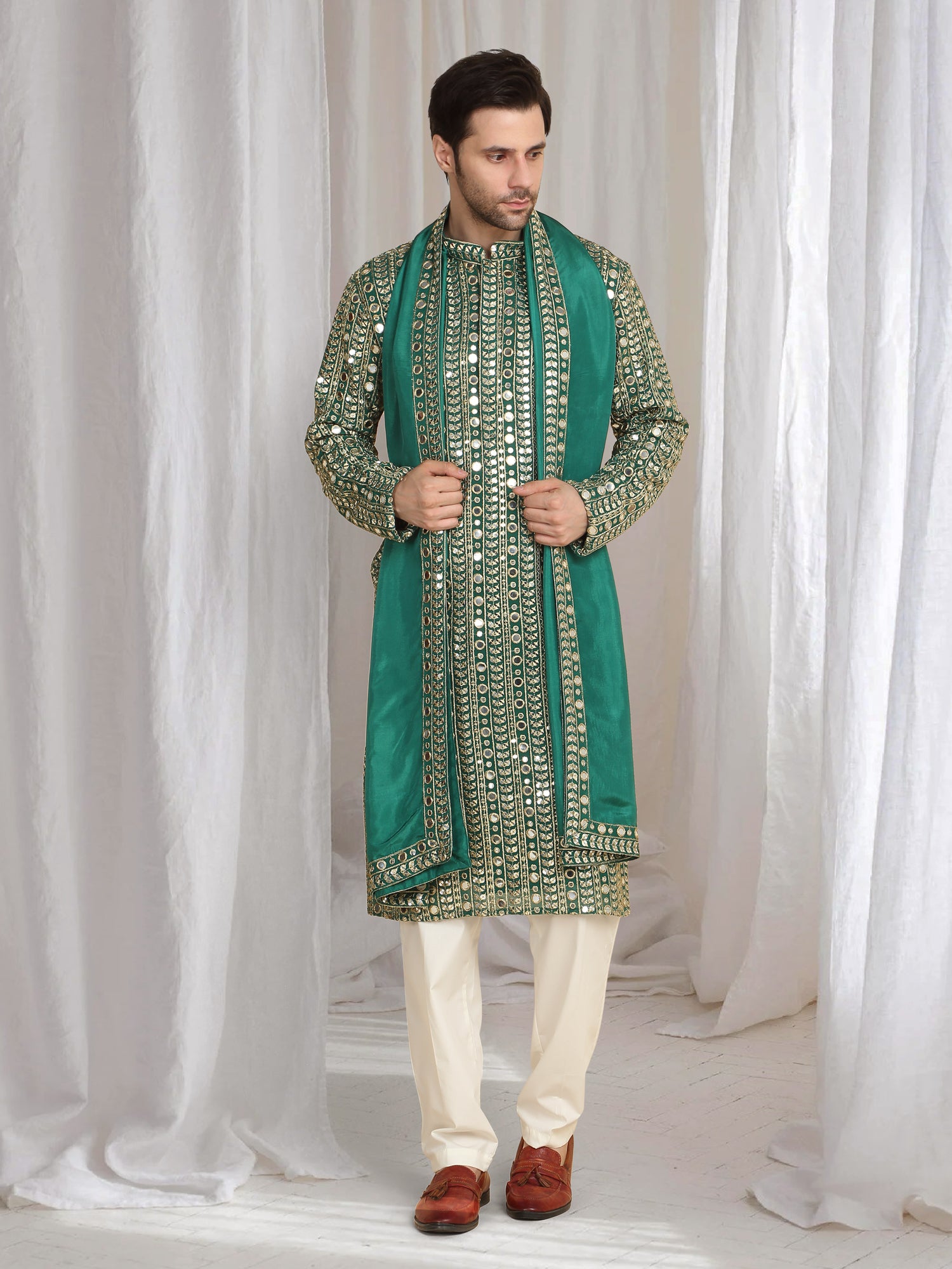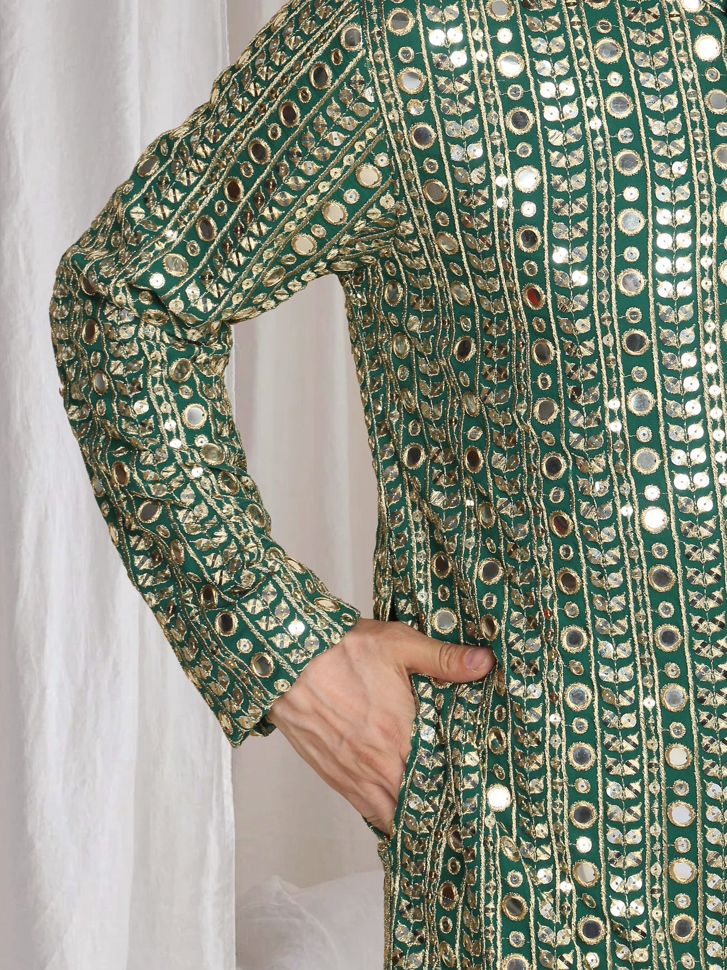 Festive Green kurta featuring golden thread embroidery and a mandarin collar. Paired with a matching green dupatta and Cream Pants. Intricate golden thread embroidery across the kurta, Mandarin collar design, Pockets integrated into the kurta.