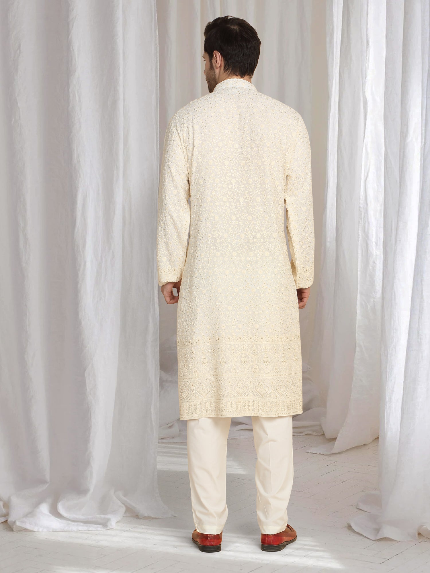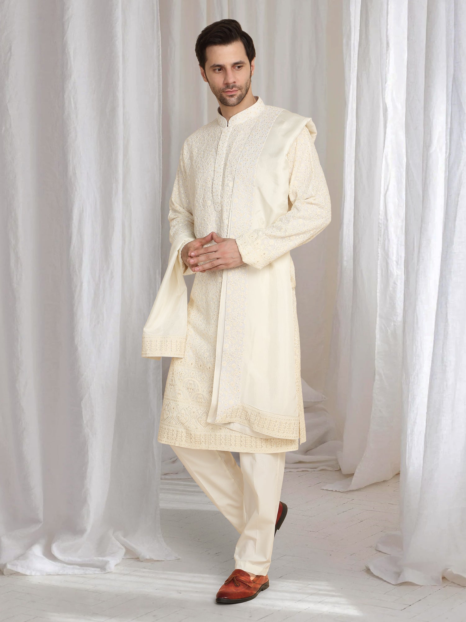 Cream kurta featuring thread embroidery and a mandarin collar. Paired with a matching dupatta in natural color.Intricate thread embroidery throughout the kurta, Mandarin collar design, Matching dupatta with embroidered edges.