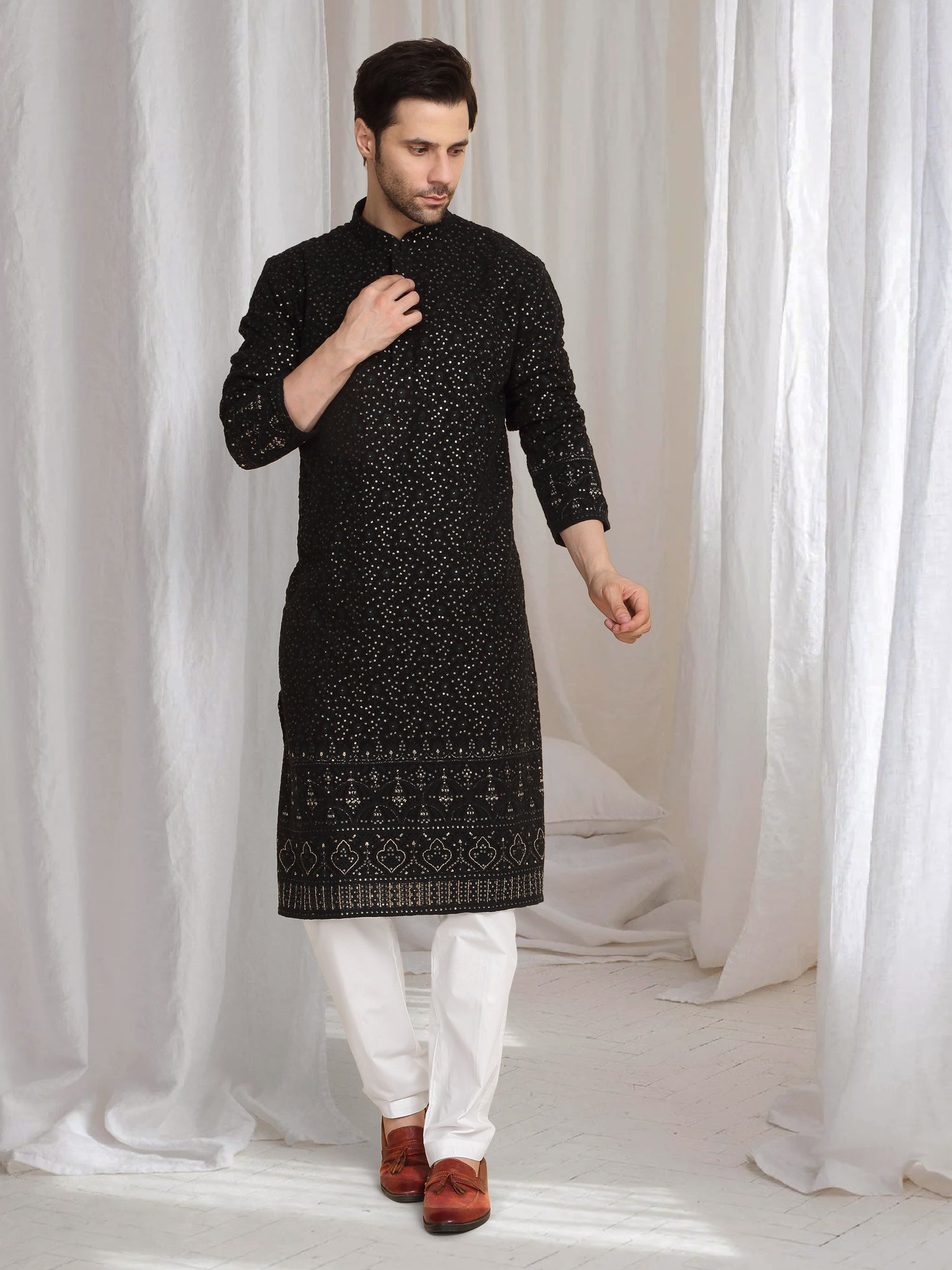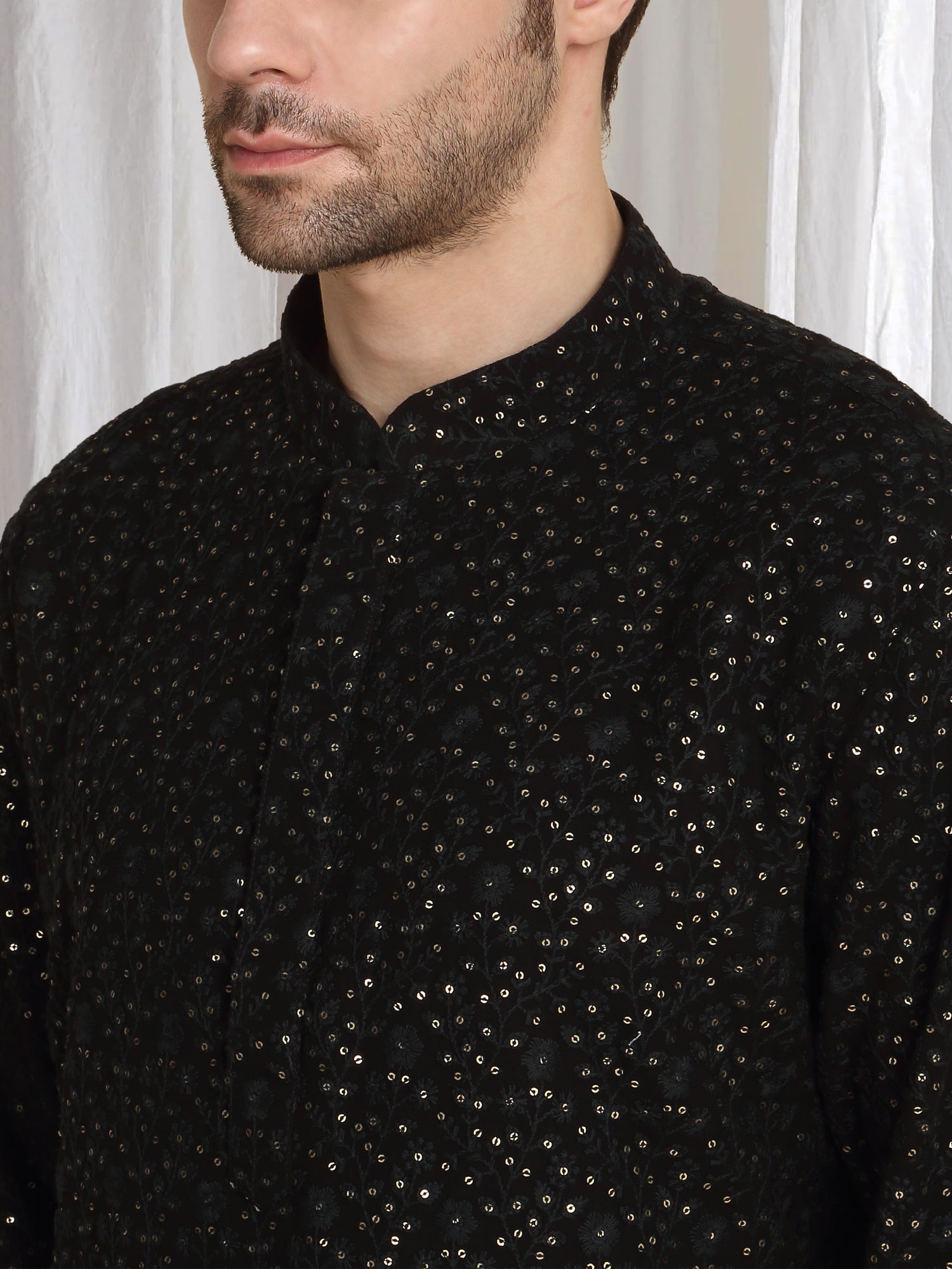 Black kurta featuring thread embroidery and a mandarin collar. Paired with a matching dupatta in natural color.Intricate thread embroidery throughout the kurta, Mandarin collar design, Matching dupatta with embroidered edges.