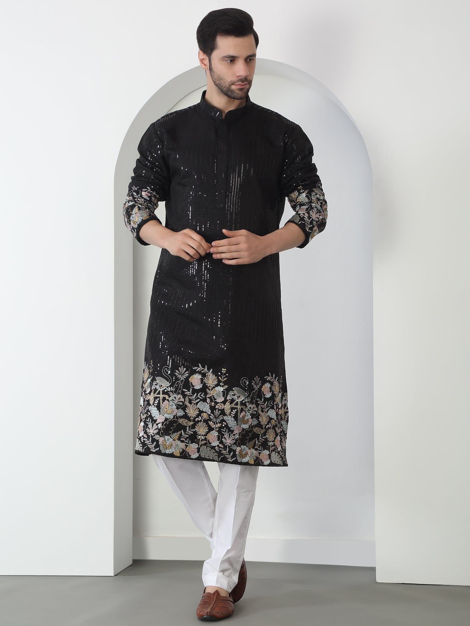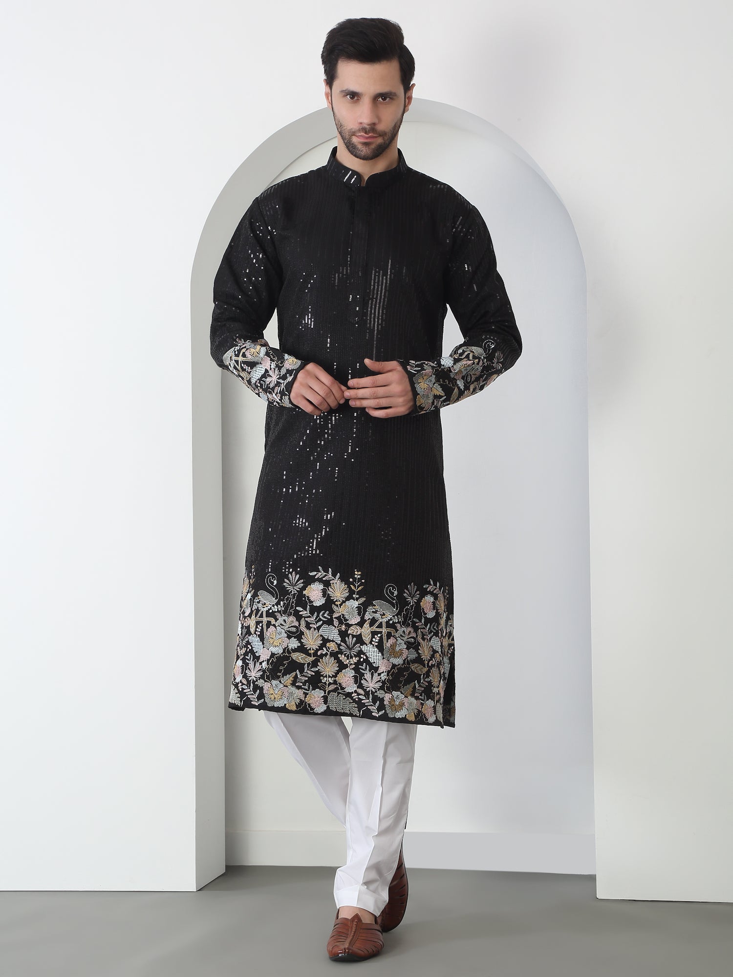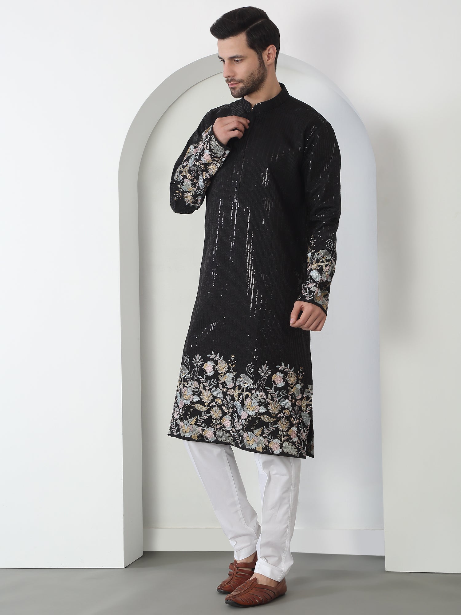 Neelkamal Black kurta featuring multi-color floral thread embroidery with sequin detailing. Paired with a solid pant and an embroidered hem dupatta.