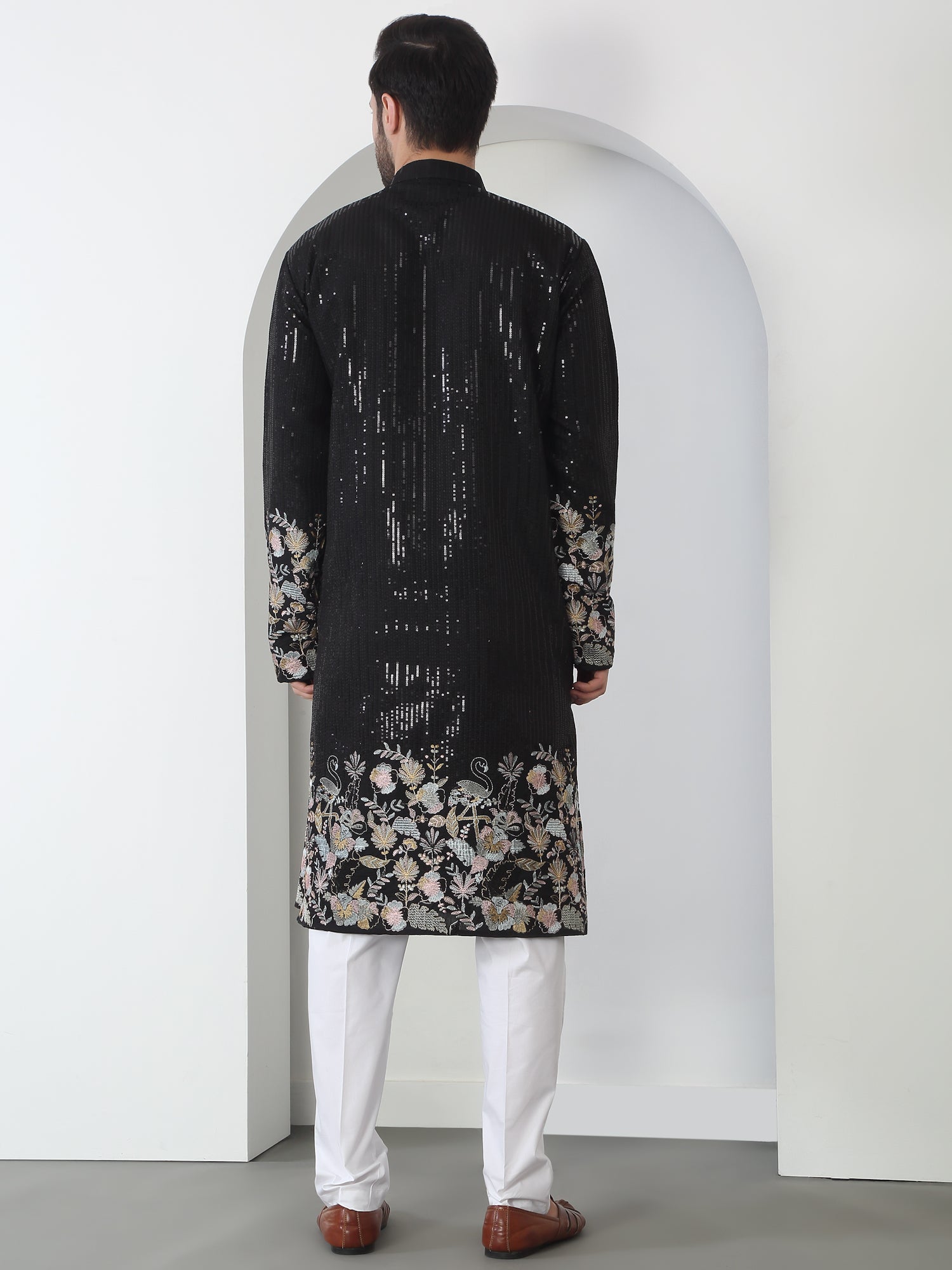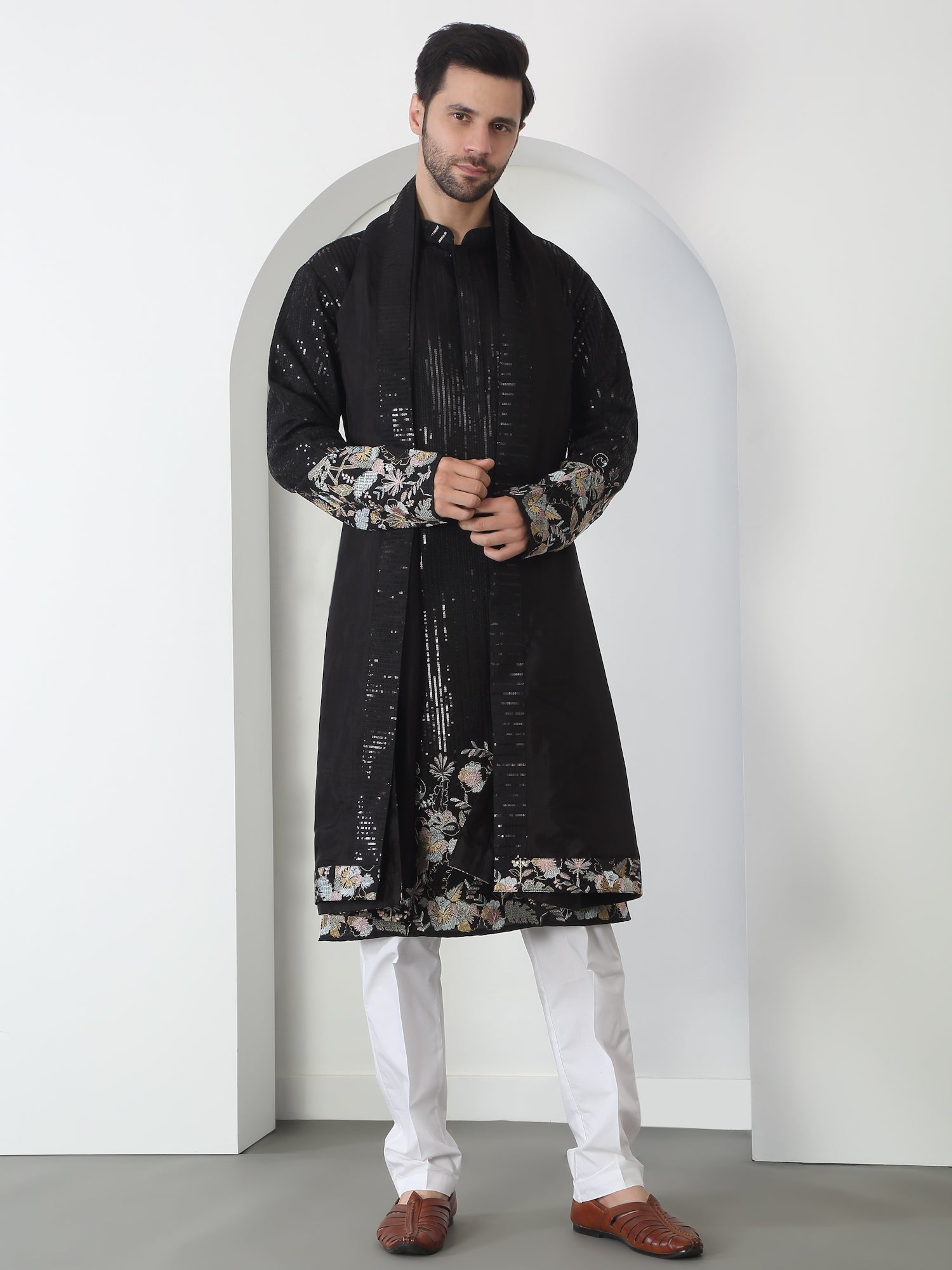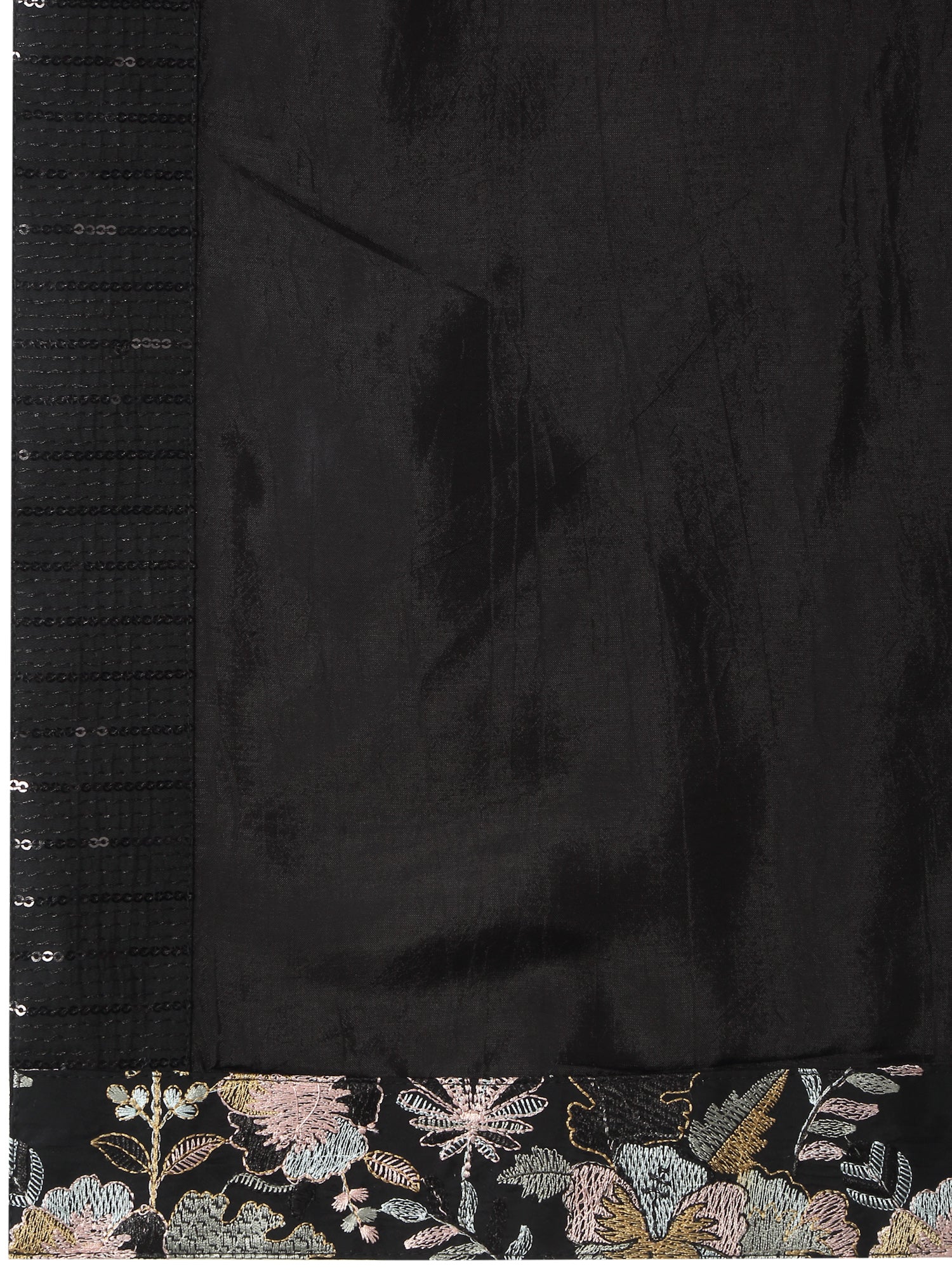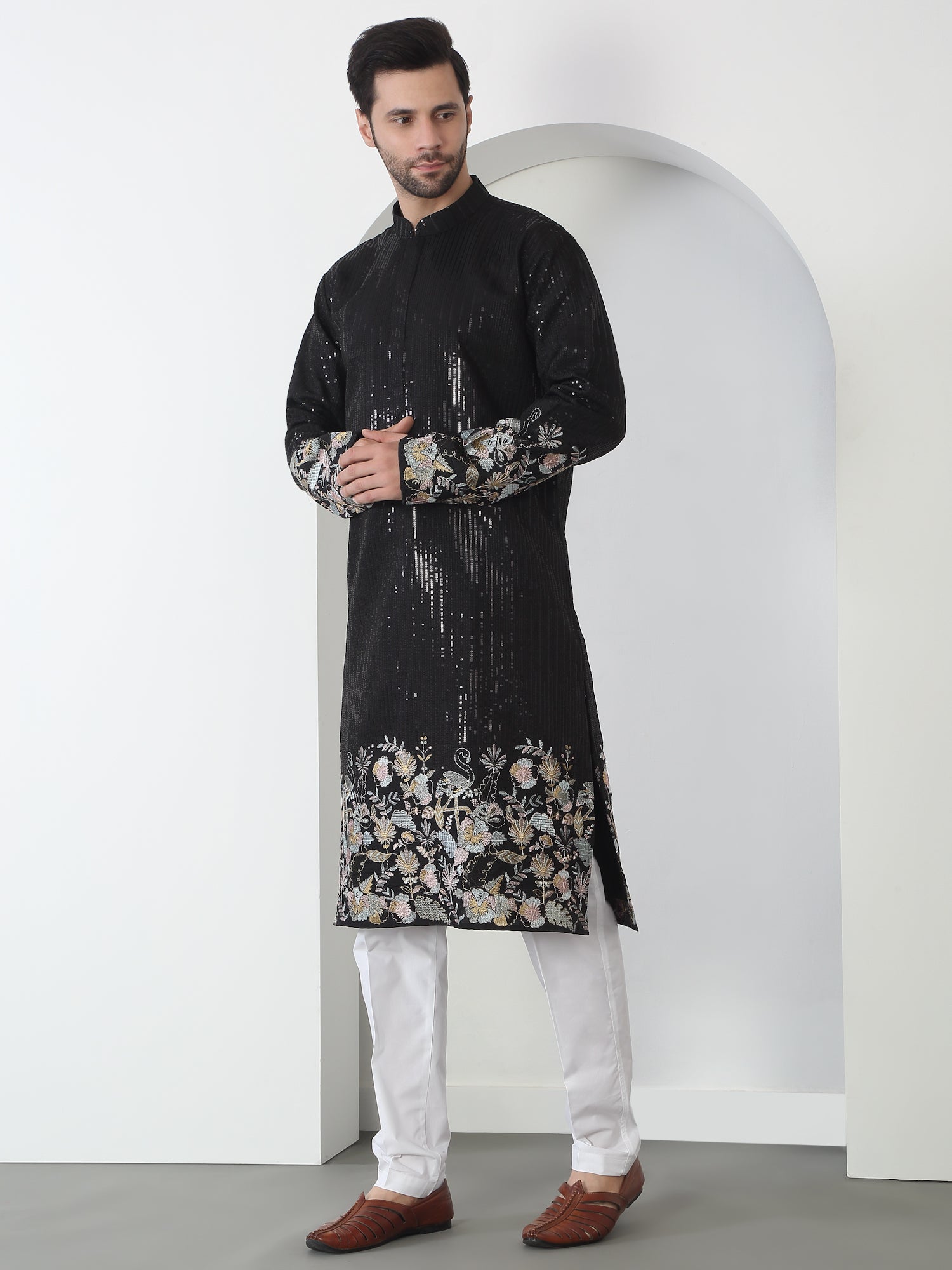 Neelkamal Black kurta featuring multi-color floral thread embroidery with sequin detailing. Paired with a solid pant and an embroidered hem dupatta.