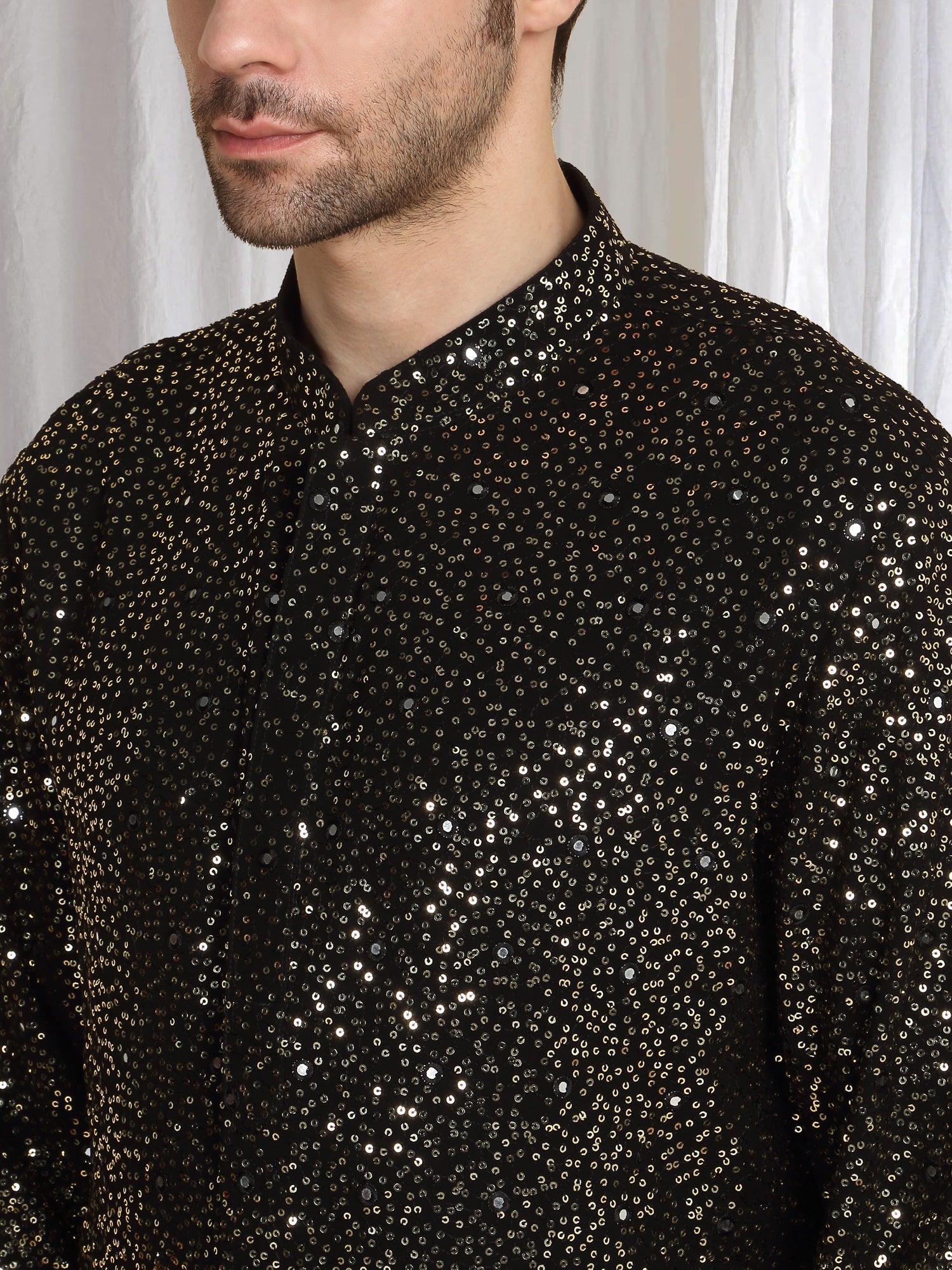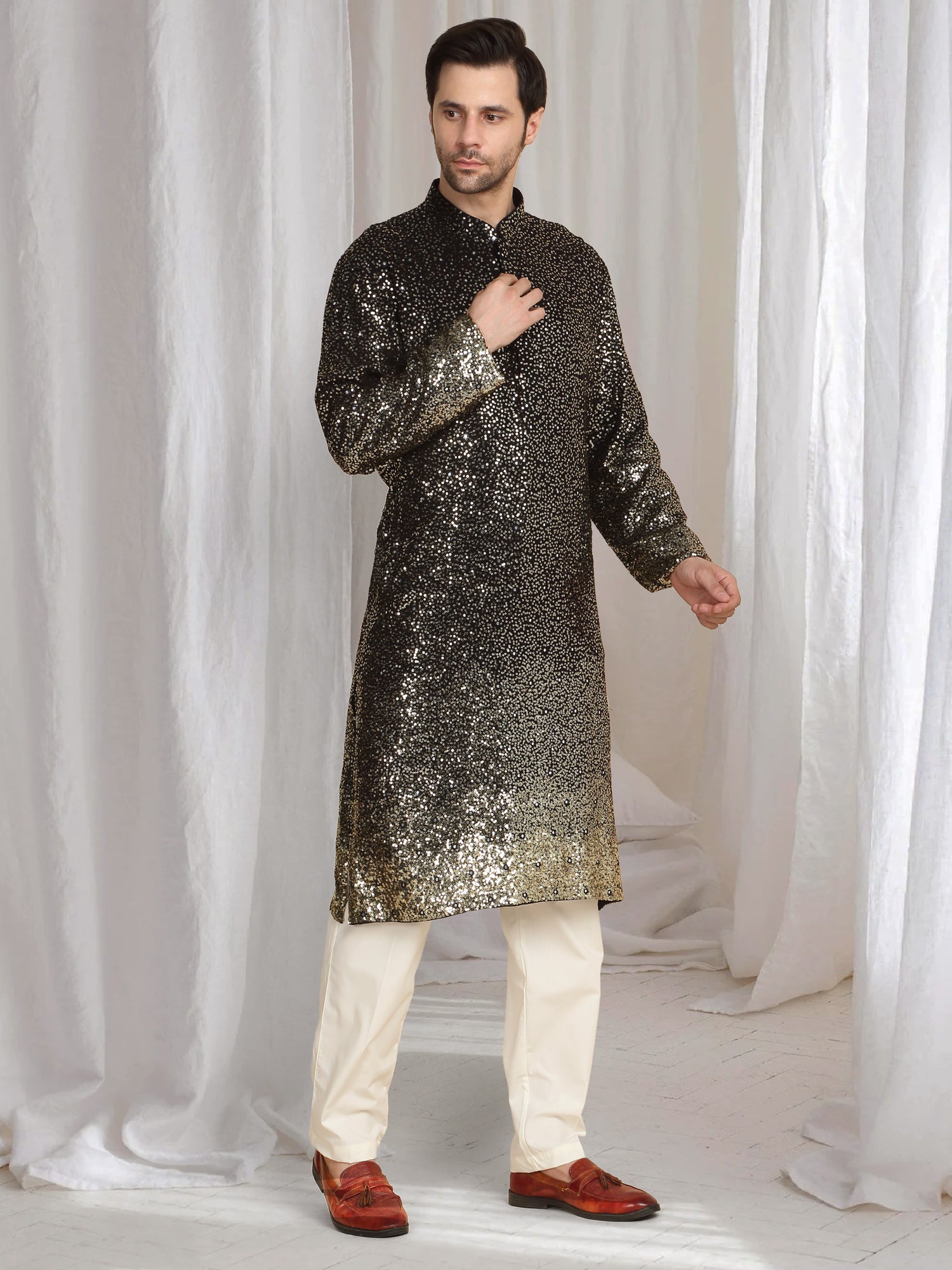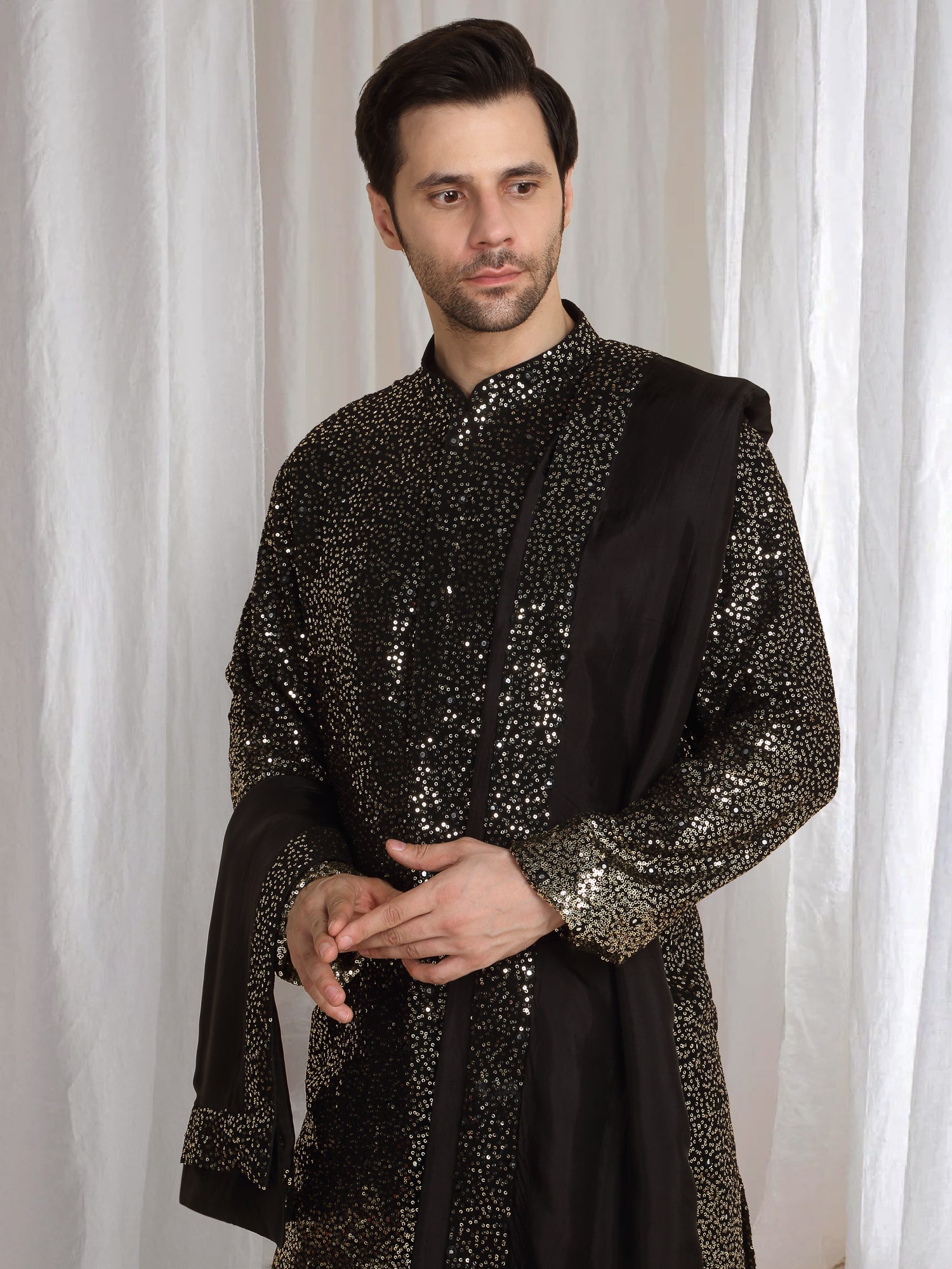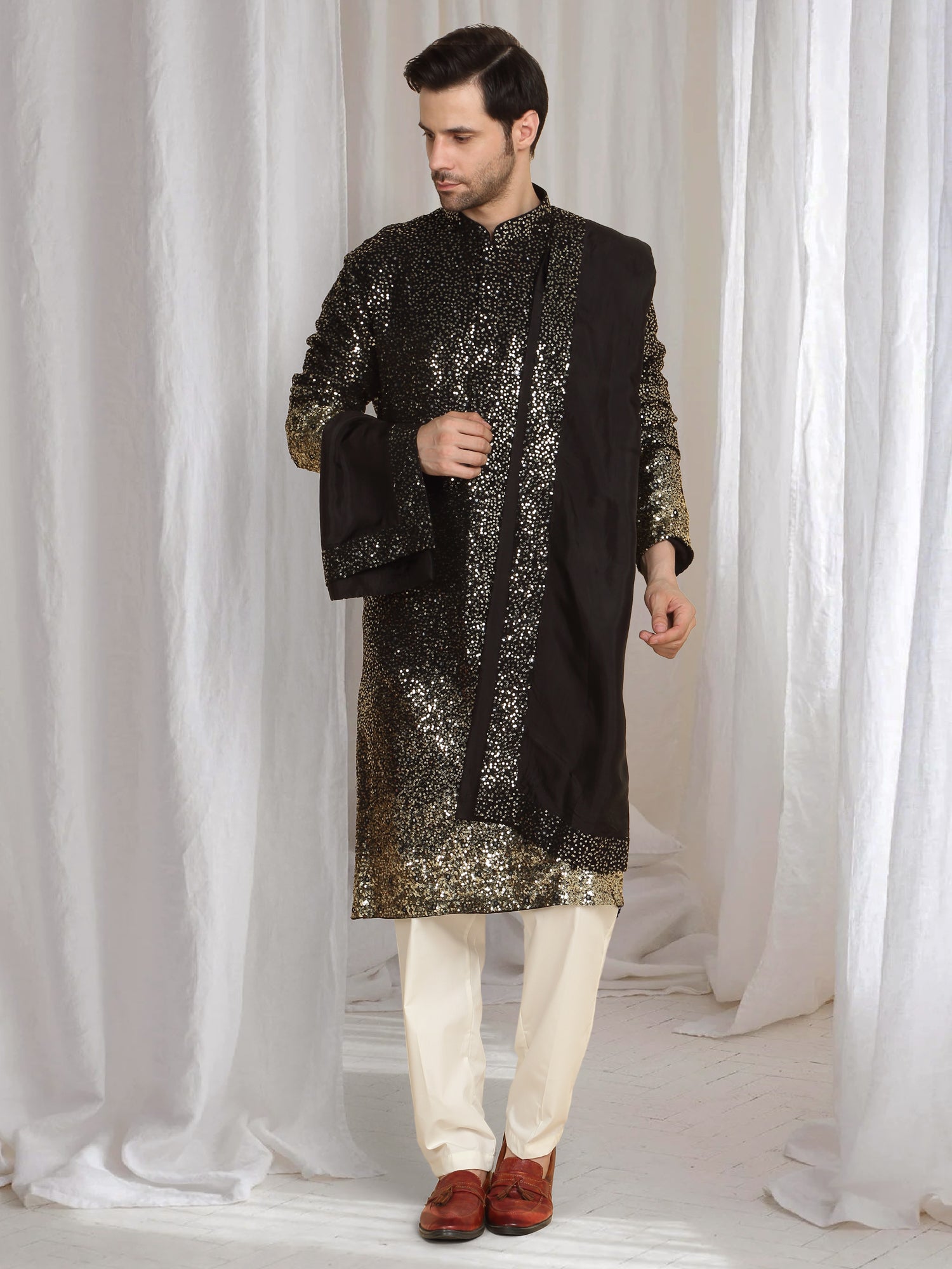 Black kurta featuring ombre sequin embroidery and a mandarin collar. Paired with a matching dupatta for a complete look.Ombre sequin details at the hem, Mandarin collar design, Intricate sequin work throughout